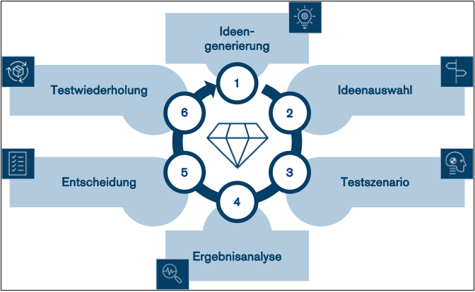 Testszenario: Für die ausgewählten Ideen gilt es, ein valides Testszenario zu entwickeln. Das kann am Anfang etwas aufwändig sein. Mit etwas Übung aber können Szenarios, die sich im Laufe der Zeit bewähren, als Vorlage für künftige Experimente hergenommen werden. Ein Testszenario besteht meistens aus einer Hypothese, einem Ziel, dem Testzeitraum und einem Vergleichswert. Zum Beispiel: „Wir glauben, dass eine Landing Page, die für eine spezifische Persona entwickelt wird, innerhalb von 14 Tagen zu einer 20 % höheren Conversion Rate führt, als eine generische Landing Page, die alle Personas ansprechen soll."