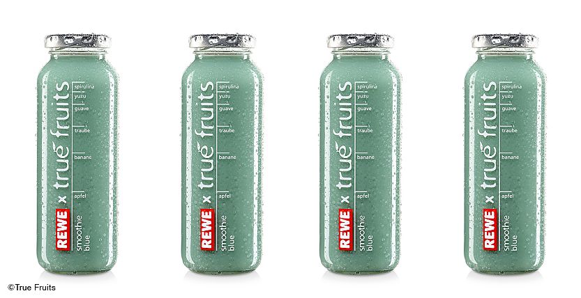 - Das rote REWE-Logo verschandelt die klassische weiß bedruckte True-Fruits-Flasche.